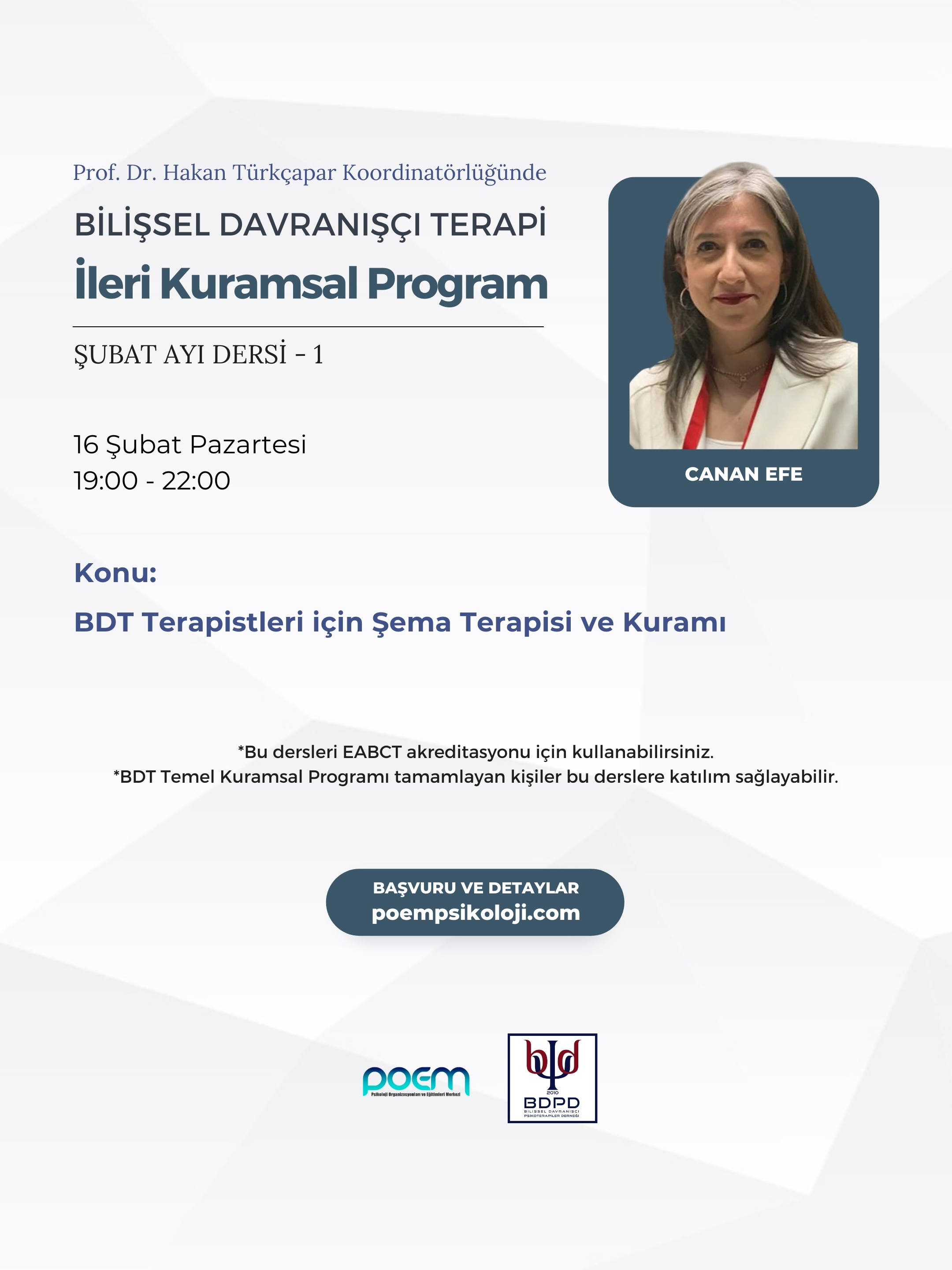 “BDT Terapistleri için Şema Terapisi ve Kuramı” dersi, Uzm. Dr. Canan Efe eğitmenliğinde 16 Şubat Pazartesi günü, saat 19.00 - 22.00 arasında gerçekleştirilecektir.