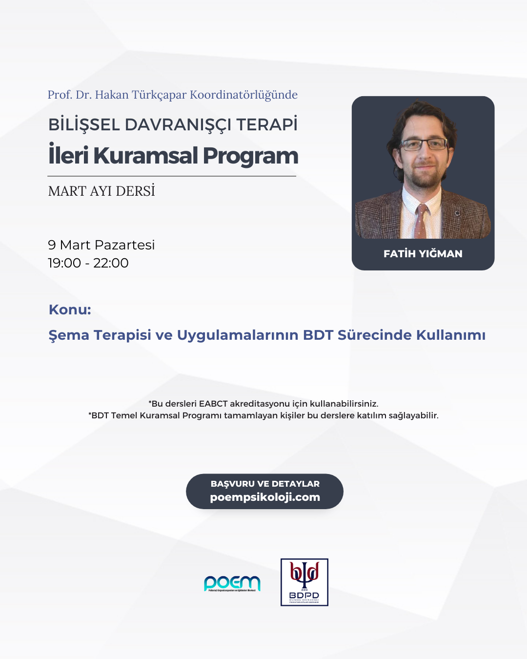 “Şema Terapisi ve Uygulamalarının BDT Sürecinde Kullanımı” dersi, Doç. Dr. Fatih Yığman eğitmenliğinde 9 Mart Pazartesi günü, saat 19.00 - 22.00 arasında gerçekleştirilecektir.
