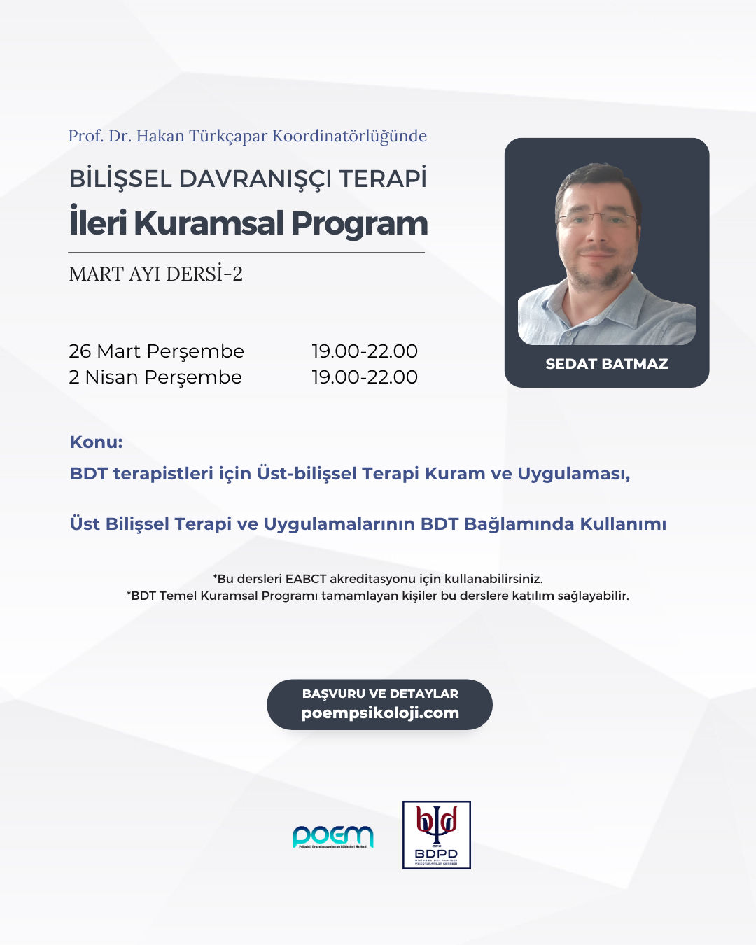“BDT terapistleri için Üst-bilişsel Terapi Kuram ve Uygulaması” ile “Üst Bilişsel Terapi ve Uygulamalarının BDT Bağlamında Kullanımı” başlıklı dersler, Prof. Dr. Sedat Batmaz eğitmenliğinde; 26 Mart ve 2 Nisan tarihlerinde, saat 19.00–22.00 arasında gerçekleştirilecektir.